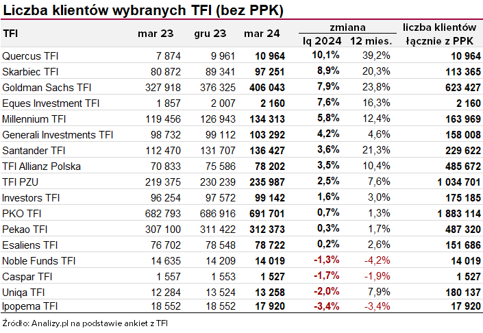 W I kwartale 2024 roku na 17 TFI publikujących dane wzrost liczby klientów odnotowało 14 z nich. Wśród nich znalazły się wszystkie towarzystwa oferujące PPK. Biorąc pod uwagę wszystkich klientów, łącznie z uczestnikami PPK, liderami rynku z liczbą klientów przekraczającą po 1 mln osób pozostają PKO TFI z 1,88 mln klientów oraz PZU TFI z 1,03 mln osób (w obu dynamika ogółem wyniosła 2,9% q/q).