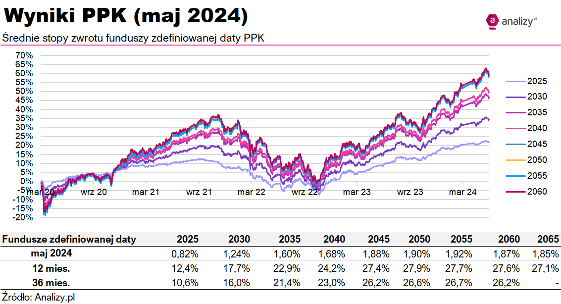 Jeszcze bardziej imponująco wyglądają wyniki w dłuższym horyzoncie. W ciągu roku średni wzrost wyniósł 22,24%, a w przypadku funduszy z datą 2045 i wyższymi zyski przekroczyły średnio 27%. Najlepsze przyniosły przeszło 32% (Investor PPK 2050 i Investor PPK 2055).