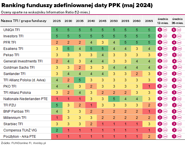 Największe spadki pod względem kolejności stały się natomiast udziałem TFI Allianz Polska, do którego należą dwa PPK, w tym jeden przejęty od Avivy. Obydwa otrzymały w maju o punkt mniej niż w kwietniu w horyzoncie rocznym, a macierzyste PPK Allianza także w horyzoncie trzyletnim. Spory spadek zaliczyło także BNP Paribas TFI po obniżeniu oceny rocznej o jeden punkt.