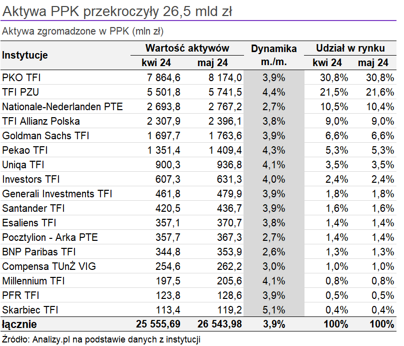Poszczególne instytucje prowadzące PPK (mogą to robić towarzystwa funduszy inwestycyjnych, powszechne towarzystwa emerytalne i zakłady ubezpieczeń) powiększyły w maju aktywa PPK w różnym stopniu. Rozstrzał przyrostu aktywów był jednak wyraźnie mniejszy niż miesiąc wcześniej, gdy dynamiki wahały się od 2,0% do 6,2%.