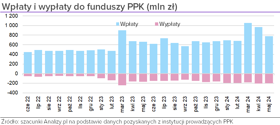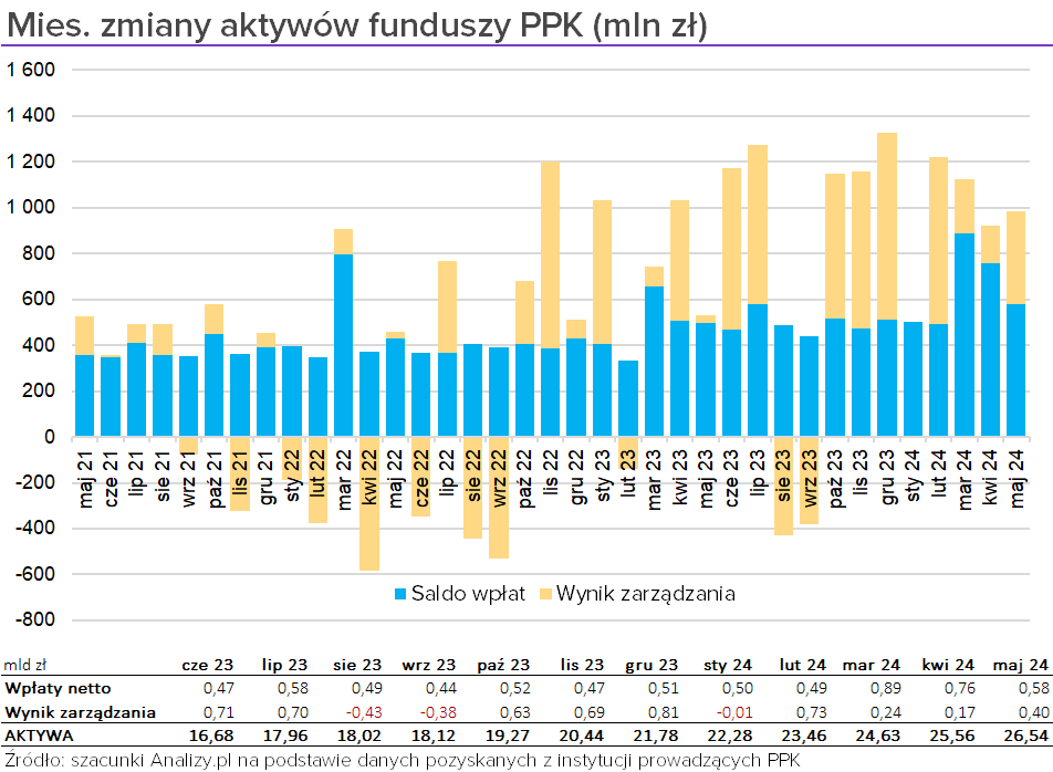 Nieco bardziej niż wynik zarządzania wpływ na wzrost aktywów ogółem miał napływ nowych środków od pracowników, pracodawców i od państwa (w maju oprócz składek wpłynęły także wpłaty powitalne osób, które warunki jej otrzymania spełniły w I kwartale roku pomniejszone o wypłaty uczestników). Z tego tytułu aktywa PPK wzrosły w maju 2024 r. o 579 milionów złotych netto. Zarządzający "dorzucili" kolejne 404 miliony.