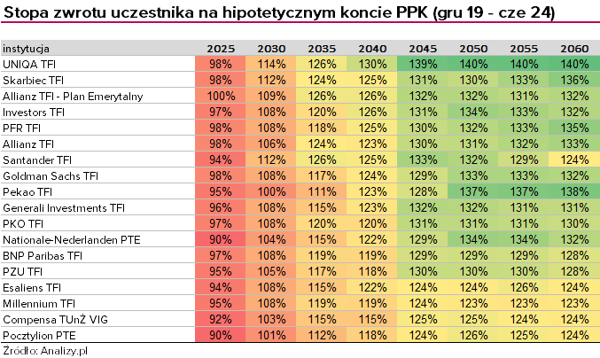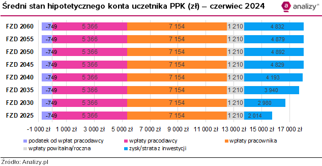 Ostatecznie osoby, które zaczęły oszczędzać w PPK w grudniu 2019 roku, do końca czerwca 2024 roku na hipotetycznym koncie uzbierały średnio od 15,7 tys. zł (w FZD 2025) do 18,6 tys. zł (w FZD z odleglejszymi datami). Ich zyski wyniosły natomiast średnio od 99% (PPK 2025) do 136% (PPK 2050).