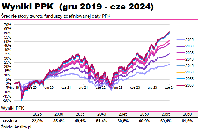 Od końcówki 2022 roku rynki z krótkimi przerwami cały czas rosną, windując wyniki funduszy PPK. Licząc od końca 2019 roku, najwięcej zarobiły fundusze inwestujące większą część aktywów na rynkach akcji, czyli te z odleglejszą datą docelową. Fundusze z datą docelową w latach 2045 do 2060 wypracowały wyniki przekraczające średnio 60%. Fundusze z najkrótszą datą docelową – w 2025 roku – przyniosły średnio 22,8% zysku.