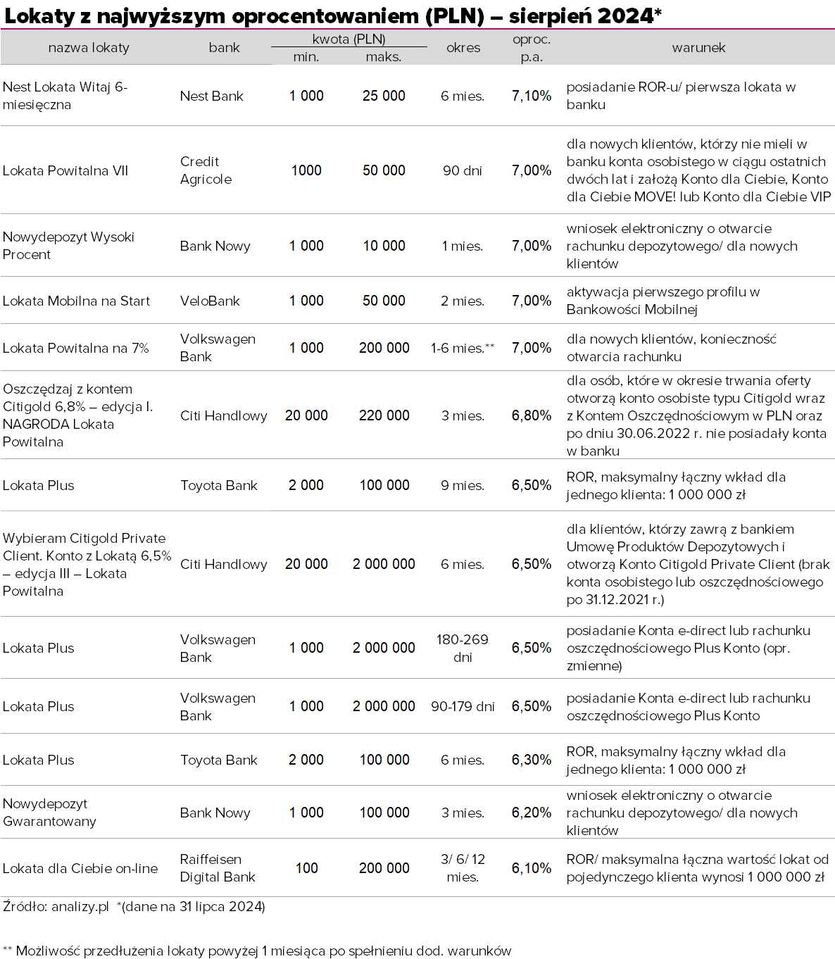 Utrzymane zostały także 7-proc. lokaty w Credit Agricole, Banku Nowym, VeloBanku i Volkswagen Banku. Wszystkie skierowane są do nowych klientów (w przypadku VeloBanku do tych, którzy aktywują swój pierwszy profil w bankowości mobilnej) i trwają od jednego miesiaca do 90 dni. Wśród nich wyróżnia się Lokata Powitalna na 7% w Volkswagen Banku, która ma wyraźnie wyższy niż konkurenci górny limit promocyjnie oprocentowanej kwoty (200 tys. zł) i skomplikowaną konstrukcję: promocja trwa tylko miesiąc, ale można ją przedłużać o kolejne jednomiesięczne okresy nawet do pół roku. Warunki: wyrażenie zgód marketingowych oraz zgody na przesyłanie informacji marketingowych elektronicznie (e-mail, SMS/MMS, serwisy internetowe, w tym portale społecznościowe) i głosowo (rozmowa telefoniczna, komunikaty głosowe IVR); rachunek został uznany kwotą 5 000 złotych w poprzednim okresie rozliczeniowym, przy czym począwszy od czwartego okresu rozliczeniowego trwania promocji, warunek ten będzie spełniony, gdy saldo rachunku na ostatni dzień poprzedniego okresu rozliczeniowego będzie nie niższe niż ta kwota; uczestnik dokonał co najmniej trzech transakcji kartowych zleconych i rozliczonych przez bank w poprzednim okresie rozliczeniowym, a ich łączna minimalna kwota wyniosła 1 000 złotych.