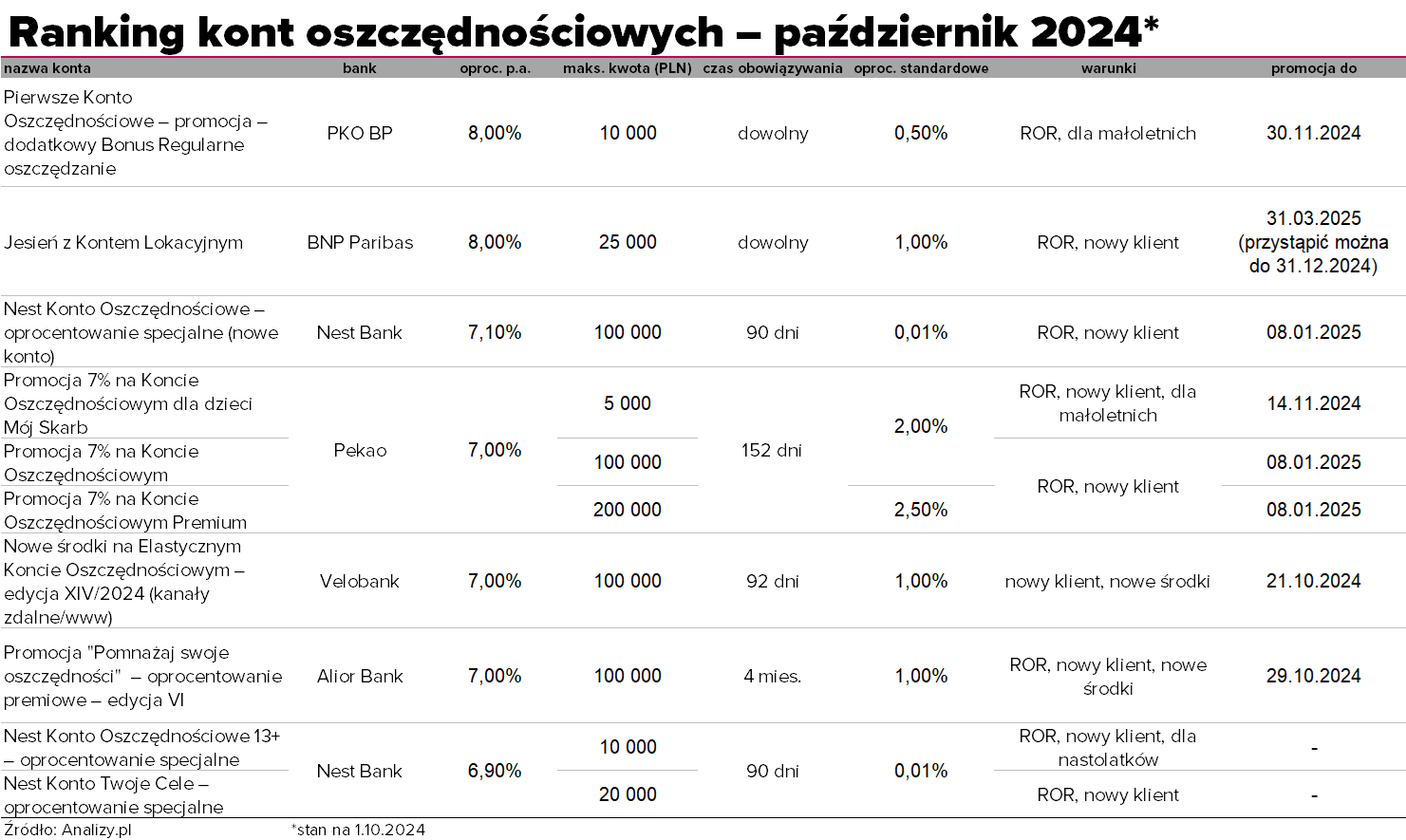 Ranking najlepszych kont oszczędnościowych dostępnych w bankach na początku października prezentuje się skromniej niż miesiąc wcześniej. Z zestawienia zniknęły trzy oferty na więcej niż 7% w skali roku, a do najlepszej dziesiątki znów po czterech miesiącach trafiły produkty z oprocentowaniem niższym niż 7%. Większość ofert wygasających z końcem września została jednak prolongowana.