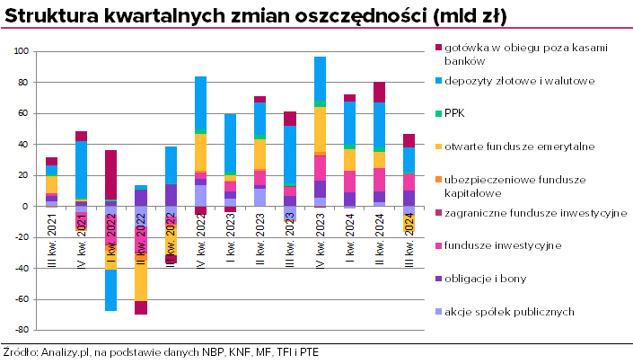 W trzecim kwartale wysoki przyrost aktywów (10,4 mld zł, co odpowiada dynamice na poziomie 7,9%) odnotowały także oszczędności zgromadzone w obligacjach skarbowych, w tym przede wszystkim w obligacjach oszczędnościowych. Miesiące wakacyjne przyniosły rekordową ich sprzedaż, sięgającą 11 mld zł miesięcznie. Wraz z pogorszeniem warunków emisji od września, sprzedaż zaczęła już słabnąć, co będzie lepiej widoczne w raporcie za IV kwartał. Na koniec września oszczędności gospodarstw domowych zgromadzone w obligacjach skarbowych przekroczyły próg 140 mld zł.