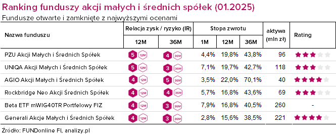 W zestawieniu funduszy z najwyższymi ocenami (czyli min. 4a w horyzoncie rocznym i min. 3a w 3-letnim) znalazły się jeszcze Rockbridge Neo Akcji Średnich Spółek, jeden fundusz indeksowy notowany na giełdzie dążący do odwzorowania składu i wyników indeksu mWIG40 - Beta ETF mWIG40TR Portfelowy FIZ (Acc) (PLN) oraz Generali Akcje Małych i Średnich Spółek. Ostatni z wymienionych funduszy przez długi czas utrzymywał najwyższą notę 5a w horyzoncie rocznym, dopiero w styczniu spadła ona do 4a. Jednocześnie w ostatniej aktualizacji ratingów odnotował wzrost oceny do czterech gwiazdek. Jest to fundusz, który od dwóch lat wyraźnie bije konkurencję. Jego portfel w porównaniu do innych funduszy akcji miś jest nieco bardziej przechylony w kierunku giełdowych maluchów. Nie jest to jednak wyznacznik – ostateczny kształt portfela determinuje bowiem potencjał do wzrostów poszczególnych podmiotów (to on jest kluczem w selekcji spółek). Komponent zagraniczny pełni raczej niewielką rolę.