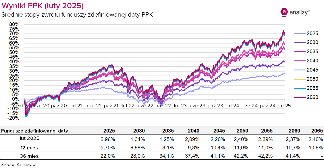 Najwyższą stopę zwrotu w lutym odnotował Pekao PPK 2050, który przyniósł 3,16%. Pozostawił nieznacznie w tyle Esaliens 2060 (+3,11%) oraz Pekao PPK 2055 (+3,09%). Słabiej powiodło się funduszom z grupy 2025; te z BNP Paribas TFI, Investors TFI i Generali Investments TFI nie pokonały bariery 0,90%.