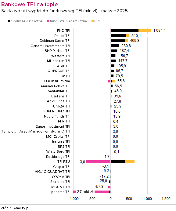 W marcu klienci wpłacili do funduszy detalicznych 3 mld zł. Wysokie saldo wpłat i wypłat (+1 mld zł) odnotowały także fundusze PPK zasilone dodatkowo dopłatami rocznymi. Marzec przyniósł natomiast wysokie odpływy środków z funduszy dedykowanych, które wyniosły aż -38 mld zł. Tym samym sumaryczny bilans sprzedaży zamknął się w kwocie -34 mld zł.