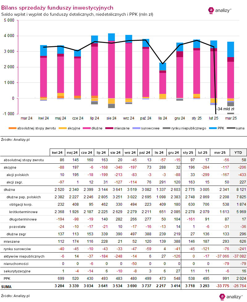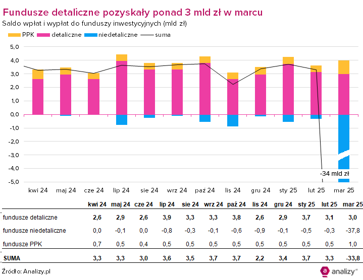 Saldo wpłat i wypłat do funduszy inwestycyjnych (marzec 2025)