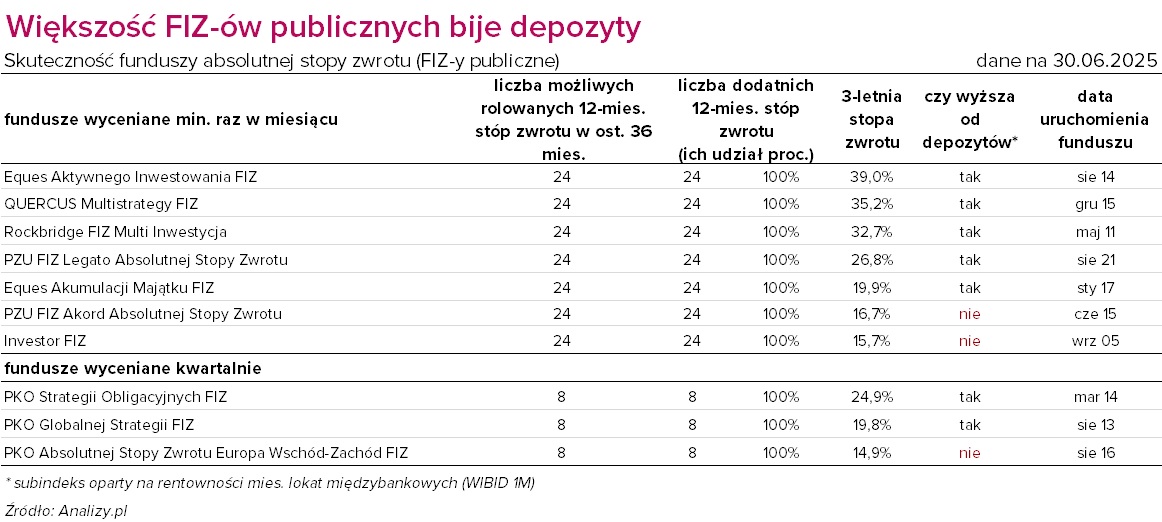 Co istotne, żaden z FIZ-ów publicznych nie notuje strat w ujęciu 3-letnim, a 7 z nich zdołało wypracować wynik wyższy niż lokaty. W gronie liderów jest Eques Aktywnego Inwestowania FIZ (+39 proc.) i QUERCUS Multistrategy FIZ (+35 proc.) – oba mają pełną skuteczność od dłuższego czasu.