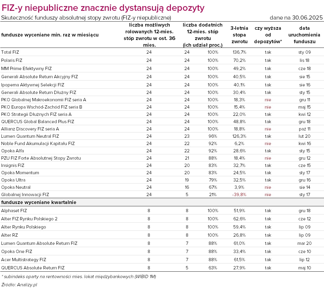 Spośród wszystkich niepublicznych FIZ-ów absolute return 22 zdołało w 3-letnim horyzoncie pobić wynik depozytów bankowych. Absolutnym liderem zestawienia pozostaje Total FIZ, z niemal 137-proc. zyskiem w skali trzech lat (i 100-proc. skutecznością) - to najlepszy wynik na tle wszystkich analizowanych funduszy (otwartych, zamkniętych i luksemburskich).