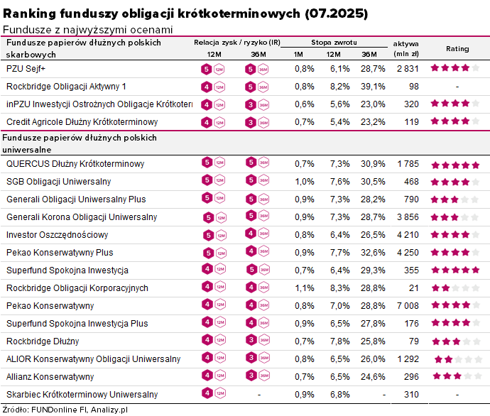 Zdecydowanym faworytem klientów w tym roku jest PKO Obligacji Skarbowych Krótkoterminowy, do którego klienci wpłacili od początku roku rekordowe 5,6 mld zł. Dzięki temu jego aktywa przekroczyły już 20 mld zł, umacniając go na pozycji największego funduszu na rynku. Ma on za sobą słaby okres w latach 2022-2023, które obciążają wyniki długoterminowe, stąd jego brak w naszym zestawieniu funduszy z najwyższymi ocenami. Ale już w krótszych terminach wypada bardzo dobrze (najwyższa ocena 5a), co w lipcowej aktualizacji ratingów zaowocowało podniesieniem noty do 3 gwiazdek.