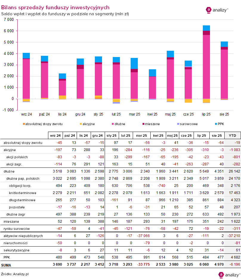 Saldo wpłat i wypłat do funduszy inwestycyjnych (sierpień 2025) - 5 mld na plusie