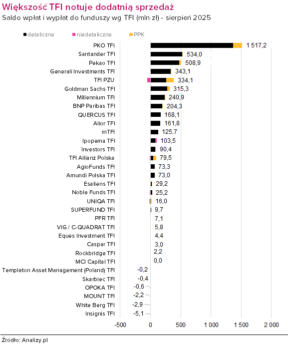 Saldo wpłat i wypłat do funduszy detalicznych wyniosło 4,5 mld zł netto w sierpniu w porównaniu do 5,8 mld zł w lipcu. Z funduszami PPK i dedykowanymi sierpniowy bilans sprzedaży zamknął się w kwocie 5,0 mld zł.