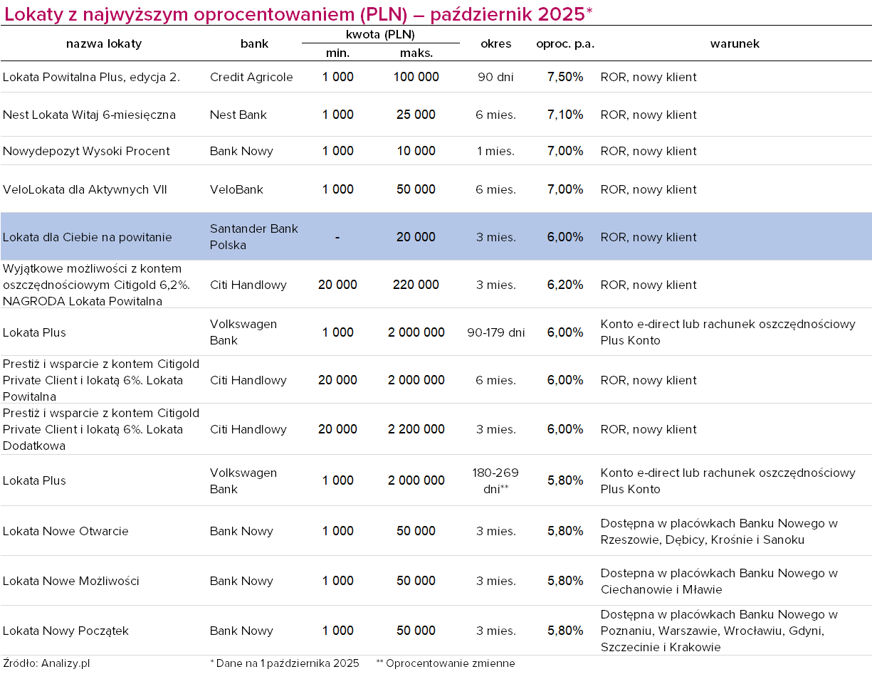 Październikową nowością jest oferta Santander Banku Polska, który wprowadził Lokatę dla Ciebie na powitanie ze stawką 6,00% w skali roku na trzy miesiące dla kwoty do 20 tys. zł. To propozycja tylko dla osób, które otwierają po raz pierwszy Konto Santander lub konto Santander Max.