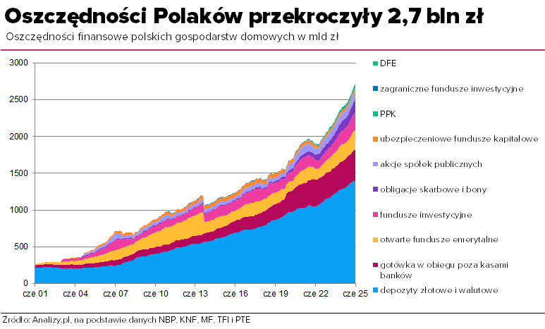 Wartość oszczędności polskich gospodarstw domowych w połowie tego roku przekroczyła 2,7 bln zł. To o +3,9% więcej niż na koniec I kwartału, oraz o +13% więcej niż w połowie 2024 roku.