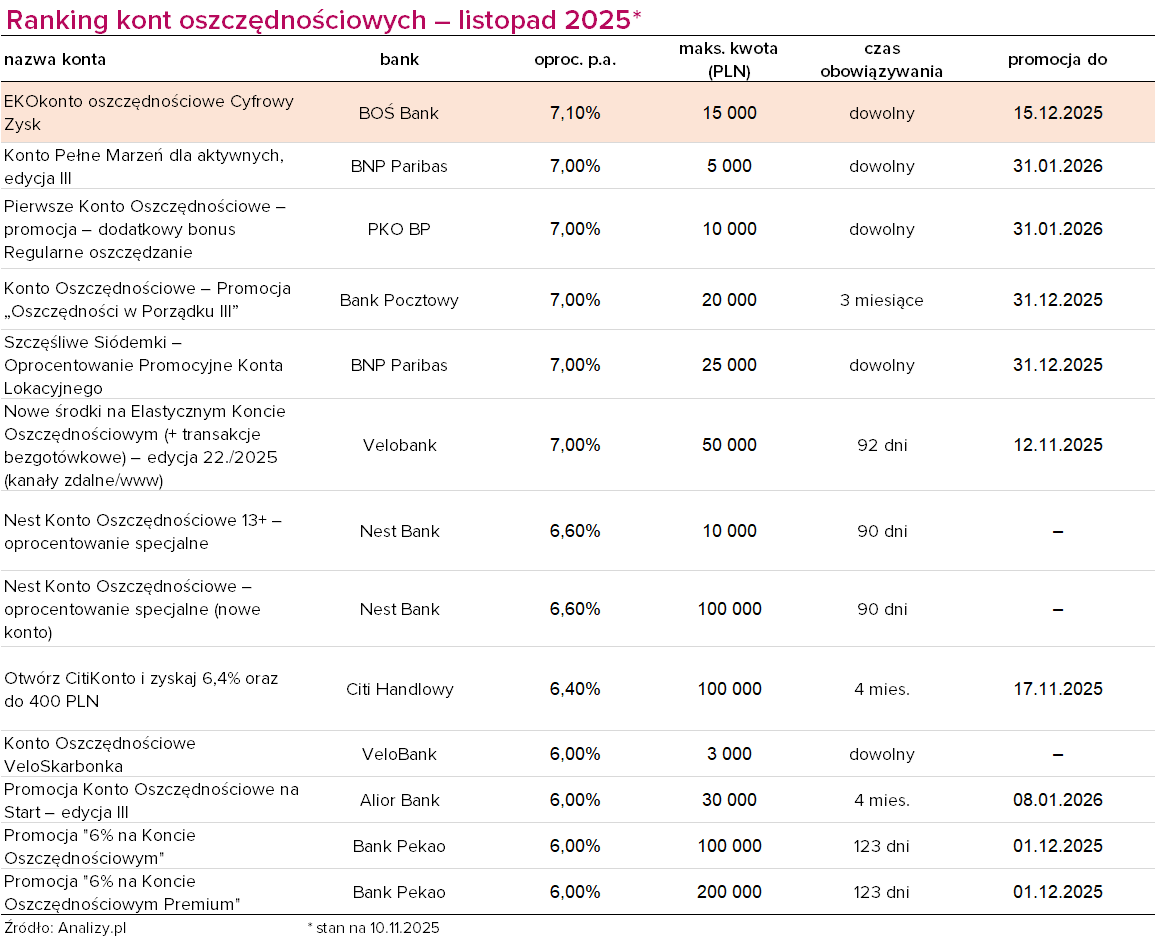 Listopadowy ranking kont oszczędnościowych otwiera, podobnie jak przed miesiącem, EKOkonto Oszczędnościowe Cyfrowy Zysk dostępne w Banku Ochrony Środowiska. Jednak tym razem, inaczej niż przed 14 października, oprocentowanie w skali roku wynosi już tylko 7,10%, a nie 8,00%. I jest to najwyższa stawka obecnie na rynku.