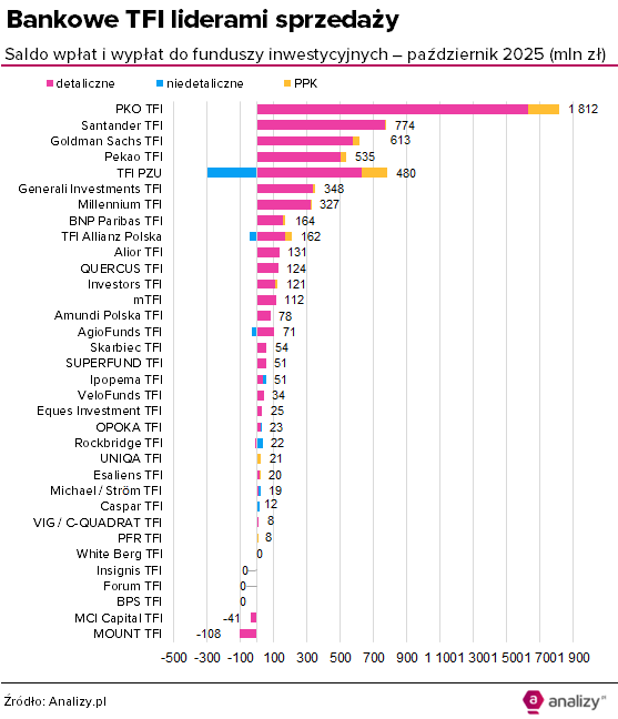 Za nami 34. miesiąc dodatniego salda wpłat i wypłat do funduszy detalicznych. W październiku pozyskały one 5,8 mld zł netto, najwięcej w historii. Cały rynek zakończył miesiąc z bilansem sprzedaży przekraczającym 6 mld zł. Najwięcej pieniędzy trafiło do funduszy dłużnych; był to także dobry miesiąc dla funduszy akcyjnych – najlepszy od ... 4 lat.