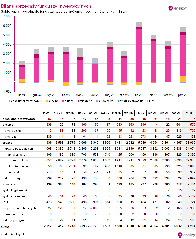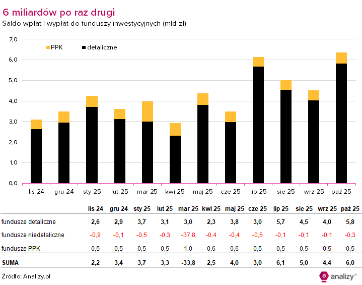 Saldo wpłat i wypłat do funduszy inwestycyjnych (październik 2025)