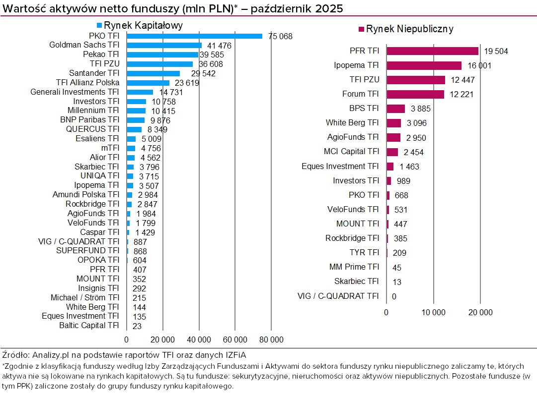Na koniec października liderem rynku pozostaje PKO TFI, które zarządza 75,1 mld zł w segmencie rynku kapitałowego oraz 668,4 mln zł w segmencie aktywów niepublicznych. Łącznie daje to niemal 75,8 mld zł. Drugie miejsce zajmuje Goldman Sachs TFI z aktywami na poziomie 41,5 mld zł, a trzecie – Pekao TFI, które zarządza 39,6 mld zł. Na kolejnych pozycjach znajdują się PZU TFI (36,6 mld zł) oraz Santander TFI (29,5 mld zł).