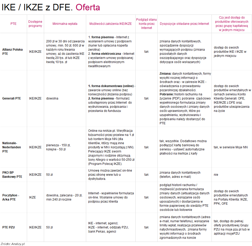 We wszystkich PTE można założyć IKE lub IKZE, dysponując niewielkimi środkami – zwykle wystarczy 50-200 zł. Wszystkie towarzystwa udostępniają obsługę online, choć zakres funkcji różni się między instytucjami. Coraz powszechniejsza jest możliwość założenia konta w pełni przez Internet, bez konieczności np. odsyłania podpisanej umowy. Towarzystwa zazwyczaj zapewniają również dostęp do wszystkich produktów oferowanych przez daną instytucję w ramach jednego kanału internetowego.