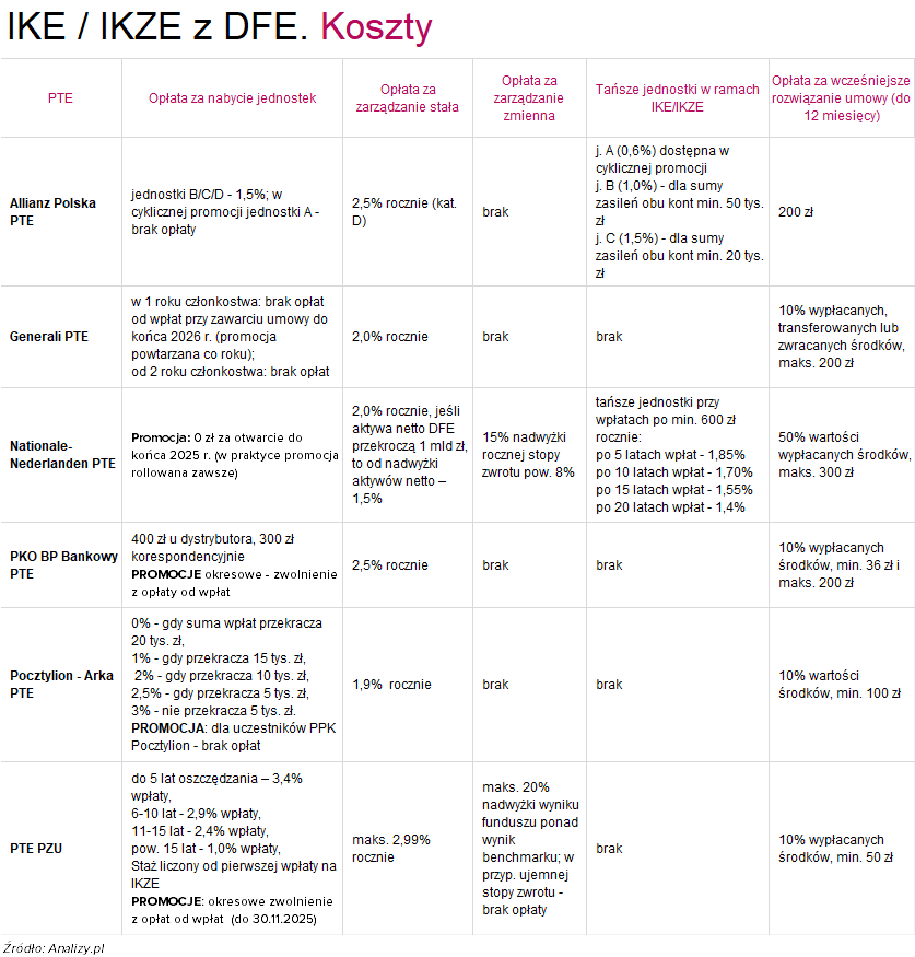 Produkty trzeciofilarowe IKE i IKZE oparte na DFE oferuje obecnie 6 PTE. Wszystkie mają w ofercie IKZE, a pięć z nich dodatkowo IKE. Zdecydowanie większą popularnością cieszy się to pierwsze konto. Na koniec czerwca 2025 r. z IKZE korzystało ponad 90 tys. osób, które zgromadziły łącznie ponad 2,3 mld zł. IKE z DFE posiadało w tym czasie 18,9 tys. oszczędzających, a wartość ich środków sięgała 0,4 mld zł.