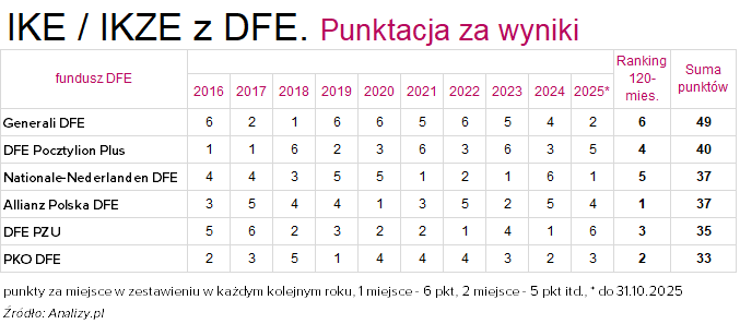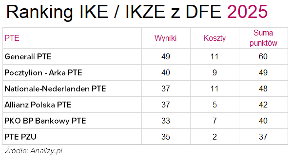 Pierwsze miejsce w Rankingu IKE/IKZE 2025 zajęło konto z Generali DFE, które wyróżnia się w obu analizowanych kategoriach. Mimo słabszego 2025 r. fundusz pozostaje liderem wyników i jednocześnie utrzymuje niskie koszty. W sumie PTE zdobyło 60 punktów.