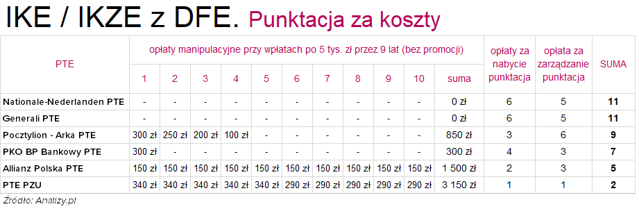 Najwięcej punktów w tej kategorii (po 11) zdobyły Nationale-Nederlanden PTE oraz Generali PTE. Obie instytucje pobierają niższe od konkurencji opłaty za zarządzanie (2,0%). Dodatkowo Nationale, oprócz standardowych jednostek, oferuje również tańsze jednostki – np. po 5 latach regularnych wpłat środki są automatycznie przenoszone do jednostki B, której koszt zarządzania jest niższy o 0,15 pkt proc. Towarzystwo stosuje także opłatę zmienną w wysokości 15% nadwyżki ponad stopę zwrotu 8%. W obu przypadkach instytucje w praktyce nie pobierają opłat manipulacyjnych za wpłaty do programów (promocje znoszące te koszty są regularnie odnawiane).