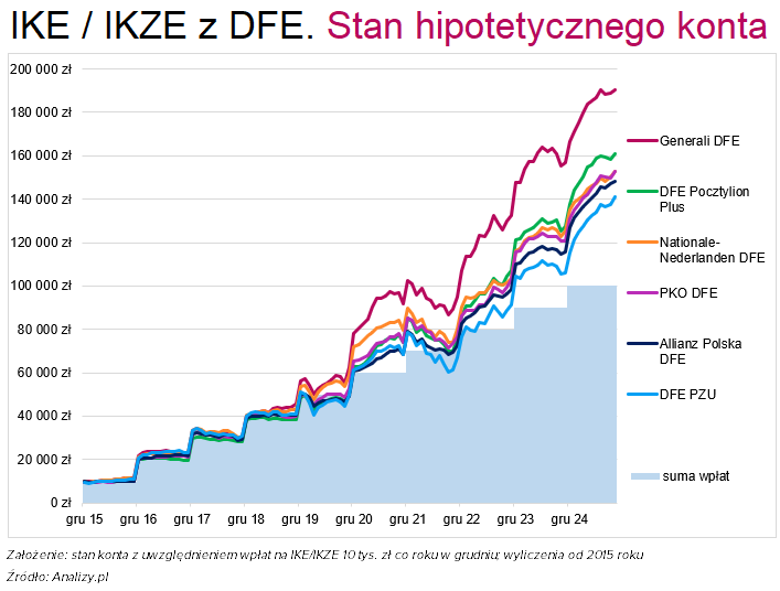 IKE i IKZE mają charakter długoterminowy, a wpłaty zwykle dokonywane są regularnie. Dlatego, oceniając efektywność DFE, warto uwzględnić także to, jak portfele zachowywały się przy systematycznym oszczędzaniu. Przeanalizowaliśmy ostatnie 10 lat, licząc od grudnia 2015 r., zakładając coroczną wpłatę 10 tys. zł, co łącznie daje 100 tys. zł. W obliczeniach uwzględniliśmy standardowe jednostki uczestnictwa.