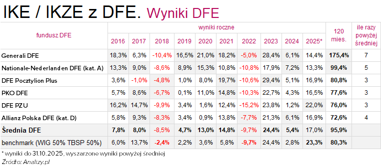 W tym czasie trzy fundusze pobiły benchmark, a jeden istotnie – Generali DFE, którego jednostka wzrosła na wartości aż o 175,4%. Pozostałe dwa to Nationale-Nederlanden DFE (kategoria A) z wynikiem +99,4% oraz DFE Pocztylion Plus, który zanotował +80,8%.
