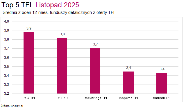 Spójrzmy jeszcze na „klasyfikację generalną” uwzględniającą wszystkie grupy funduszy. W niej listopadowy ranking wygrywa PKO TFI ze średnią ocen 3,9. Na drugie miejsce spadło TFI PZU ze średnią 3,8, a na trzecim znalazło się Rockbridge TFI z oceną 3,7.