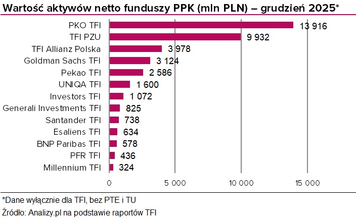 - Pod względem rocznej dynamiki (w ujęciu procentowym) największy przyrost aktywów zanotowały w 2025 r. fundusze PPK (+50,2 proc. r/r), których aktywa na koniec grudnia sięgały 39,7 mld zł (dane wyłącznie dla TFI, bez PTE i TU).