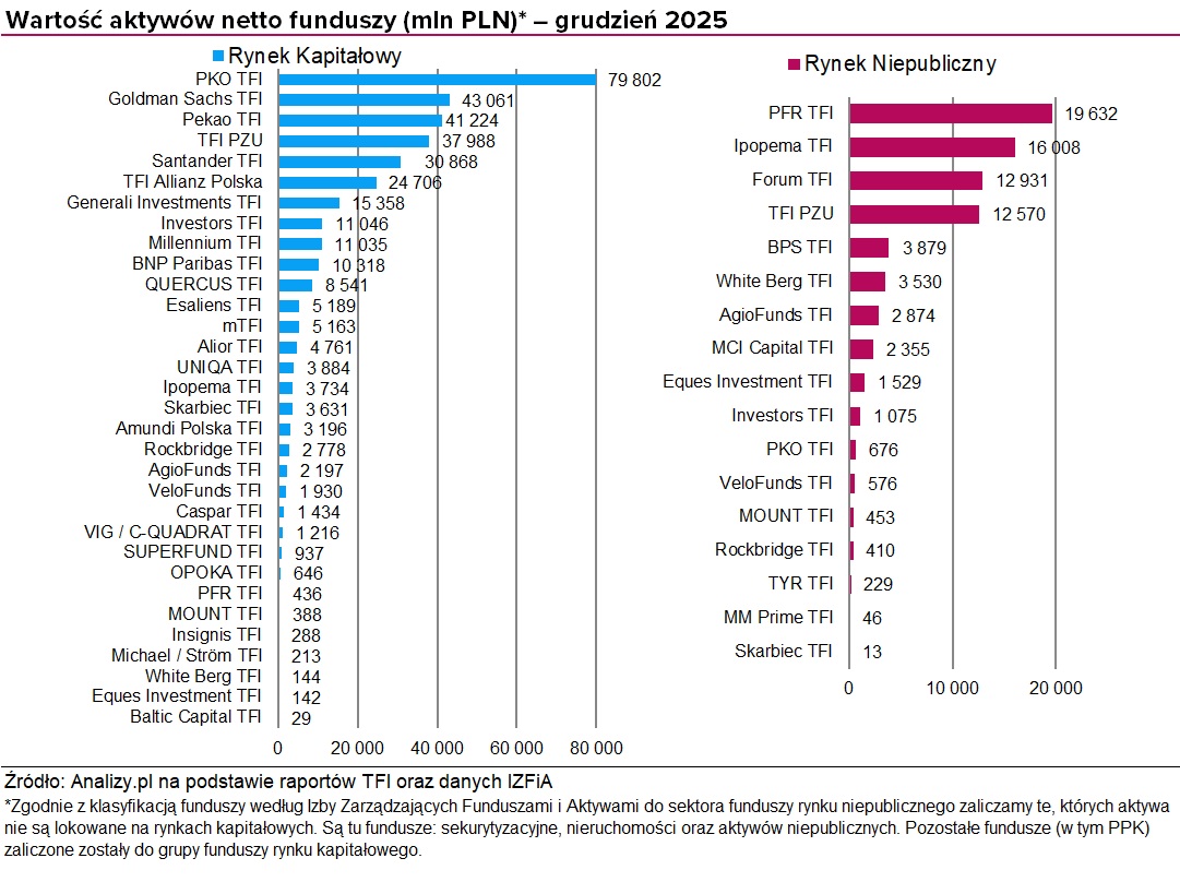 Niezmiennie najwięcej aktywów netto w segmencie rynku kapitałowego ma pod zarządzaniem PKO TFI (79,8 mld zł). Na drugim miejscu jest Goldman Sachs TFI, które posiada ponad 43,1 mld zł. Na rynku niepublicznym liderem pozostaje PFR TFI (19,6 mld zł).