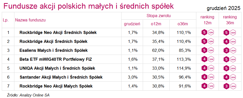 W grupie funduszy akcji polskich małych i średnich spółek najwyższe oceny 5a w obu horyzontach otrzymał: Rockbridge Neo Akcji Średnich Spółek. W porównaniu z rankingiem sprzed roku największy skok zaliczył Esaliens Małych i Średnich Spółek, którego noty 12-mies. przebyły drogę z najniższego poziomu 1a do najwyższego.