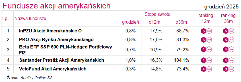 W grupie funduszy akcji amerykańskich kryteria najlepszych funduszy spełniło 6 produktów. Tu także pozytywnie wyróżniły się fundusze indeksowe: inPZU Akcje Amerykańskie O oraz PKO Akcji Rynku Amerykańskiego, które wysokie noty otrzymują od wielu miesięcy. Spadek formy w skali roku zaliczył natomiast Esaliens Spółek Innowacyjnych (z 5a do 1a).