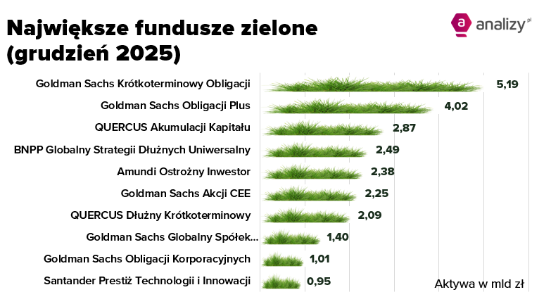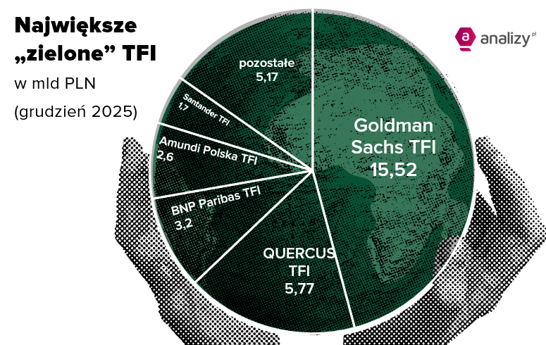 Niezmiennie najwięcej funduszy deklarujących zgodność z art. 8 lub art. 9 SFDR ma w ofercie Goldman Sachs TFI – 12, których aktywa warte były na koniec 2025 roku 15,5 mld zł.