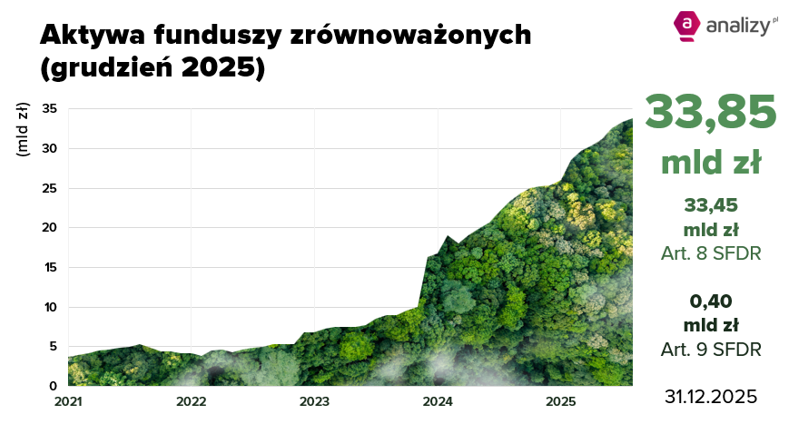 Rok 2025 był bardzo udany dla funduszy deklarujących zgodność z art. 8 i 9 SFDR umownie zwanych „zrównoważonymi”, a potocznie funduszami ESG. W 12 miesięcy wartość aktywów w nich zgromadzona wzrosła o 49% do 33,8 mld zł na koniec grudnia 2025 roku.