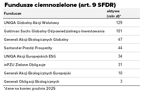 W ofercie krajowych funduszy zrównoważonych przeważają produkty jasnozielone, które jedynie „promują” aspekty środowiskowe i społeczne. Funduszy, które mają na celu zrównoważone inwestycje, na koniec grudnia 2025 roku było jedynie 8. Najwięcej tego typu produktów ma w ofercie Generali Investments TFI (3), ale pod względem aktywów największe zgromadził UNIQA Globalny Akcji Walutowy (129 mln zł), który wyprzedził dotychczasowego lidera Goldman Sachs Globalny Odpowiedzialnego Inwestowania.