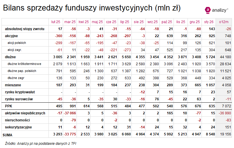 Saldo wpłat i wypłat do funduszy inwestycyjnych (styczeń 2026) - rekord