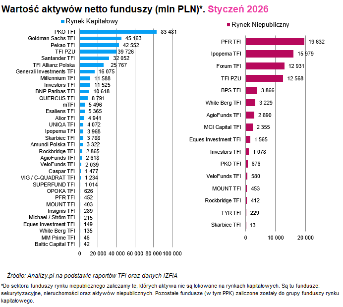Niezmiennie najwięcej aktywów netto w segmencie rynku kapitałowego ma pod zarządzaniem PKO TFI (83,5 mld zł). Na kolejnych dwóch miejscach znajdują się Goldman Sachs TFI z 45,2 mld zł oraz Pekao TFI z 42,6 mld zł. Na rynku niepublicznym liderem pozostaje #PFR TFI (19,6 mld zł).