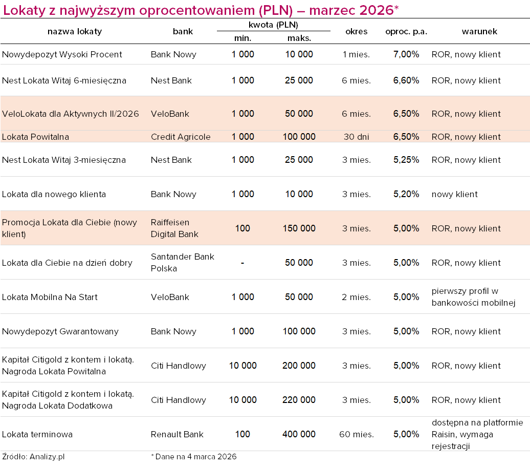 Ofert na równo 5% jest w tym miesiącu aż siedem. Znajdziemy je w Santanderze Banku Polska (Erste Bank Polska), VeloBanku, Banku Nowym, Citi Handlowym (spadek z 5,50%) oraz Renault Banku (spadek z 5,15%; 5-letnia Lokata terminowa dostępna jest przez platformę Raisin). Pozostałe depozyty są krótkoterminowe (2-3 miesiące). Kwoty maksymalne wahają się od 50 tys. zł w przypadku Santandera i Velobanku do 400 tys. zł w Renault Banku.