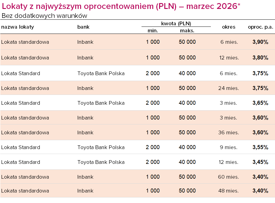 Na trzecim miejscu wśród lokat bez warunków znajdziemy dwa produkty: Lokatę Standard na 6 miesięcy w Toyota Banku oraz Lokatę standardową na 24 miesiące w Inbanku. Obie płacą 3,75% w skali roku. Wszystkie Lokaty standardowe w Inbanku dotyczą kwot od 1 tys. zł do 50 tys. zł, natomiast Lokaty Standard w Toyocie – od 2 tys. zł do 40 tys. zł.