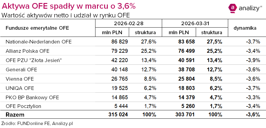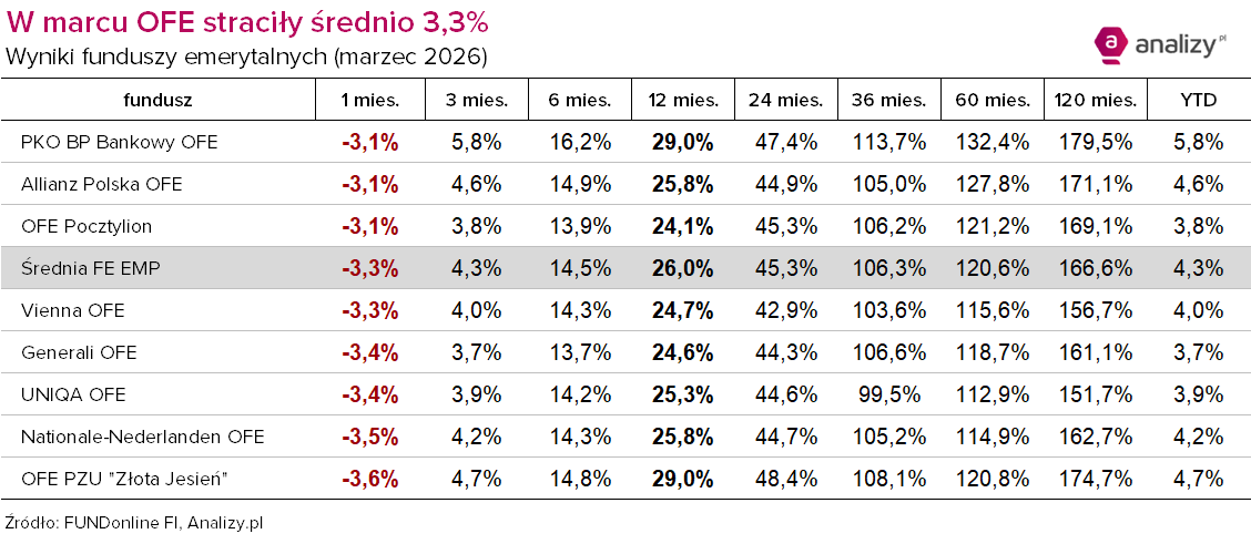 Ostatniego dnia lutego, w weekend, USA i Izrael zaatakowały Iran, a w miarę upływu kolejnych dni marca stawało się jasne, że wojna szybko się nie skończy. Zyskał dolar, podrożała ropa naftowa, przeceniły się obligacje i aktywa rynków wschodzących. Większość giełd odnotowała spadki, a GPW nie była wyjątkiem. Odbiło się to na wynikach i aktywach OFE.