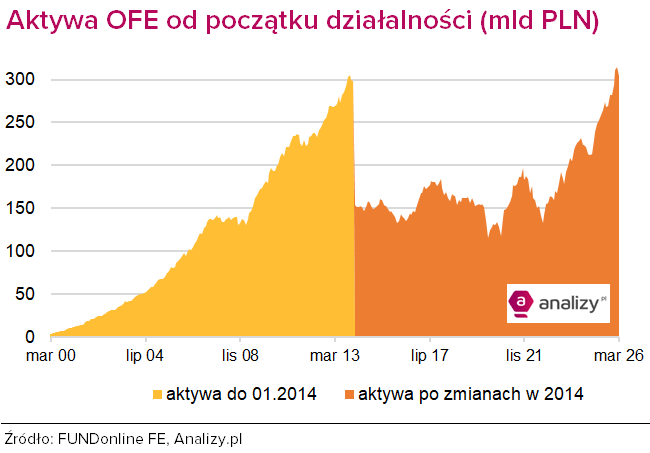 Dla wyników zarządzania osiąganych przez fundusze emerytalne największe znaczenie mają jednak notowania z GPW, gdyż ok. 80% aktywów OFE mają ulokowane w akcjach krajowych spółek. W marcu OFE straciły średnio 3,3%, czyli 10,55 miliarda złotych. Jednak w perspektywie rocznej wciąż mogą się pochwalić dwucyfrową, 26-proc. stopą zwrotu, a w horyzoncie trzech i więcej lat zyski są ponad 100-procentowe.