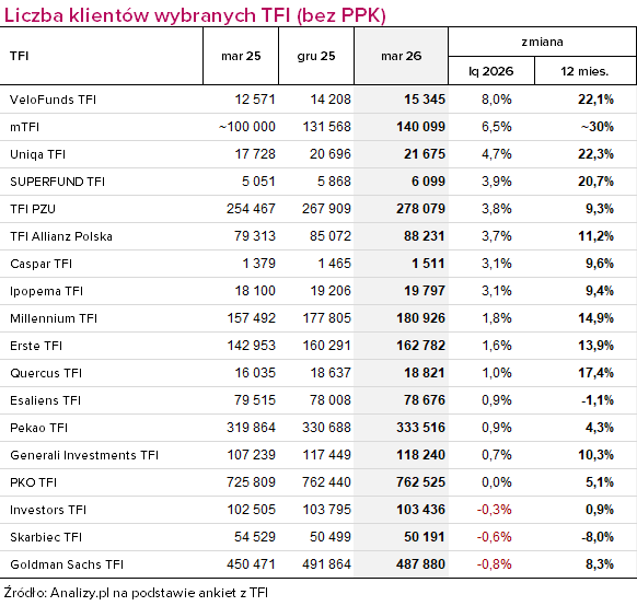 Na kolejnych miejscach znalazły się instytucje, które nie prowadzą PPK, ale w ostatnich kwartałach wyraźnie zwiększają skalę działalności. Chodzi o VeloFunds TFI, dawniej Noble Funds TFI, którego fundusze po dłuższej przerwie wróciły w ubiegłym roku do oferty VeloBanku, oraz mTFI, którego produkty są dostępne w mBanku. W obu przypadkach kwartalna dynamika przekroczyła 6%, a w ujęciu rocznym liczba klientów wzrosła o ponad jedną piątą.
