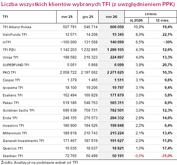 W I kwartale 2026 r. liczba klientów posiadających jednostki uczestnictwa oraz certyfikaty funduszy inwestycyjnych wzrosła w TFI średnio o 3,7%. Częściowo był to efekt dalszego rozwoju PPK, do których przystępują kolejni pracownicy. Najwyższą dynamikę odnotowało Allianz Polska TFI, które w ciągu trzech miesięcy zwiększyło liczbę klientów o 10,9%, do ponad 606 tys. osób. Po wyłączeniu PPK wzrost w tej instytucji również pozostał wysoki, choć był niższy i wyniósł 3,7%.