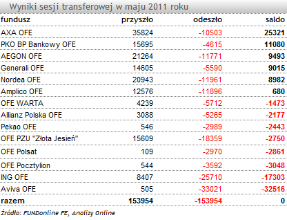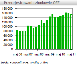 Liczba migrujących uczestników OFE podczas majowej sesji transferowej była niższa niż podczas lutowej sesji o -4,5 % i wyniosła 153 tys. Liczba uczestników OFE, którzy zmienili towarzystwo cały czas utrzymuje się na wysokim poziomie i po raz czwarty w historii przekroczyła 150 tys. osób. Pierwszy raz ten pułap został pokonany w sierpniu 2010 r.