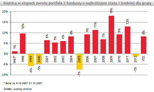 Tymczasem, okazuje się, że inwestycja w nowy fundusz często przynosi lepsze wyniki niż w fundusz działający od lat. Taki wniosek płynie z analizy wyników funduszy akcji polskich uniwersalnych za ostatnie 16 lat. By to sprawdzić zbudowaliśmy portfel z nowo utworzonych produktów i stworzyliśmy dla niego średnią. W jej skład w każdym momencie inwestycji wchodziły 3 najnowsze rozwiązania. W dniu, gdy na rynku pojawiała się pierwsza wycena nowego funduszu, automatycznie wchodził on do średniej nowych funduszy. W tym samym momencie z grupy wypadał najstarszy produkt. Okazuje się, iż w 16-letniej historii funduszy akcji polskich uniwersalnych aż 12-krotnie rezultat uzyskany przez nowe rozwiązania był lepszy od przeciętnego wyniku w grupie.