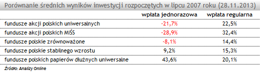 Ci, którzy ulokowali środki w przeciętny fundusz akcji polskich uniwersalnych pod koniec lipca 2007, dziś liczą stratę -21,7%. Ci, którzy w tym samym momencie rozpoczęli inwestycję, ale odkładali co miesiąc jednakową kwotę, dziś mogą liczyć zyski rzędu +22%. Trzeba jednak dodać, iż początki nie były dla nich łatwe. W początkowej fazie indeksy traciły przez wiele miesięcy i przez pierwsze 2 lata wartość zgromadzonego kapitału była niższa od sumy wpłaconych środków. Dopiero w 2009 roku, kiedy rynek silnie odbił, sytuacja się odwróciła na korzyść inwestorów "regularnych". W późniejszym okresie wynik inwestycji jeszcze po silnej korekcie w połowie 2011 roku przez kilkanaście miesięcy był ujemny, jednak od listopada zeszłego roku inwestorzy znów mogą liczyć zyski.